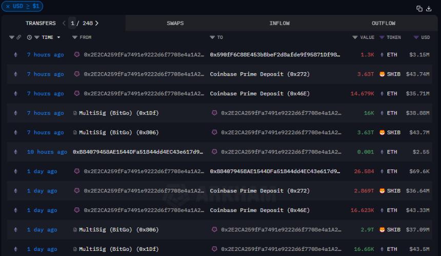 鲸鱼钱包将3.2万亿SHIB转移至Coinbase Prime