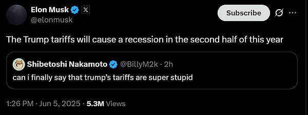 马斯克还直接抨击特朗普的关税政策,称该政策将导致美国经济在今年下半年进入衰退。