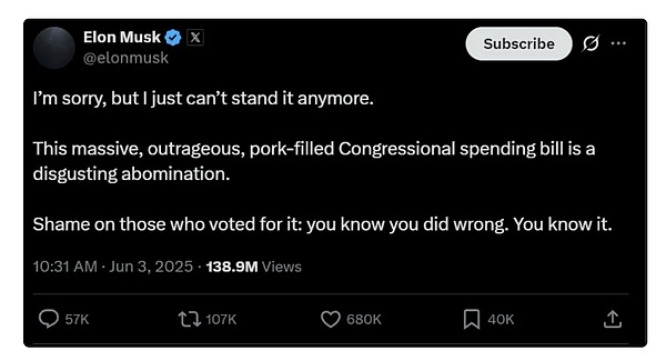 就在马斯克辞去政府效率部门(DOGE)负责人职务不到一周后,他公开表示对特朗普政府提出的“大而美法案”的失望。