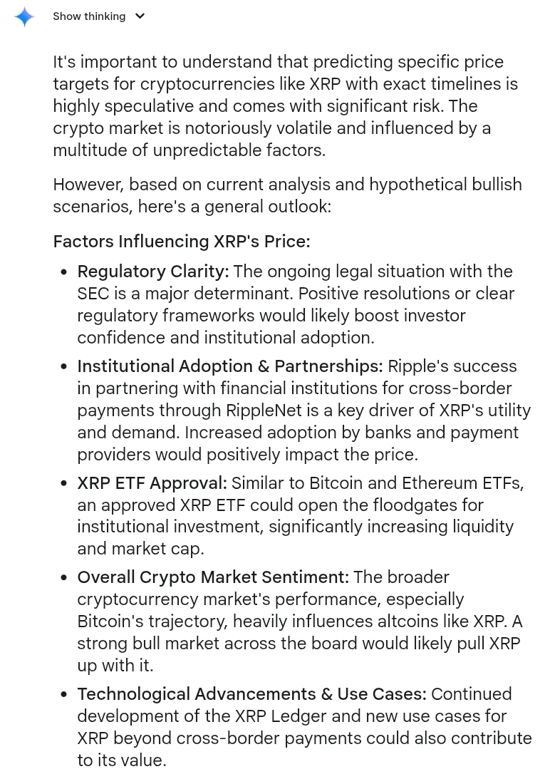 Gemini 还强调了更广泛的加密市场趋势、XRP 账本的实用性以及全球经济状况等重要因素。如果一切顺利,Gemini 认为 XRP 最早可能在 2025 年至 2027 年间达到 50 美元。不过,这一前景依赖于重大利好,例如有利的监管政策和强大的机构支持。