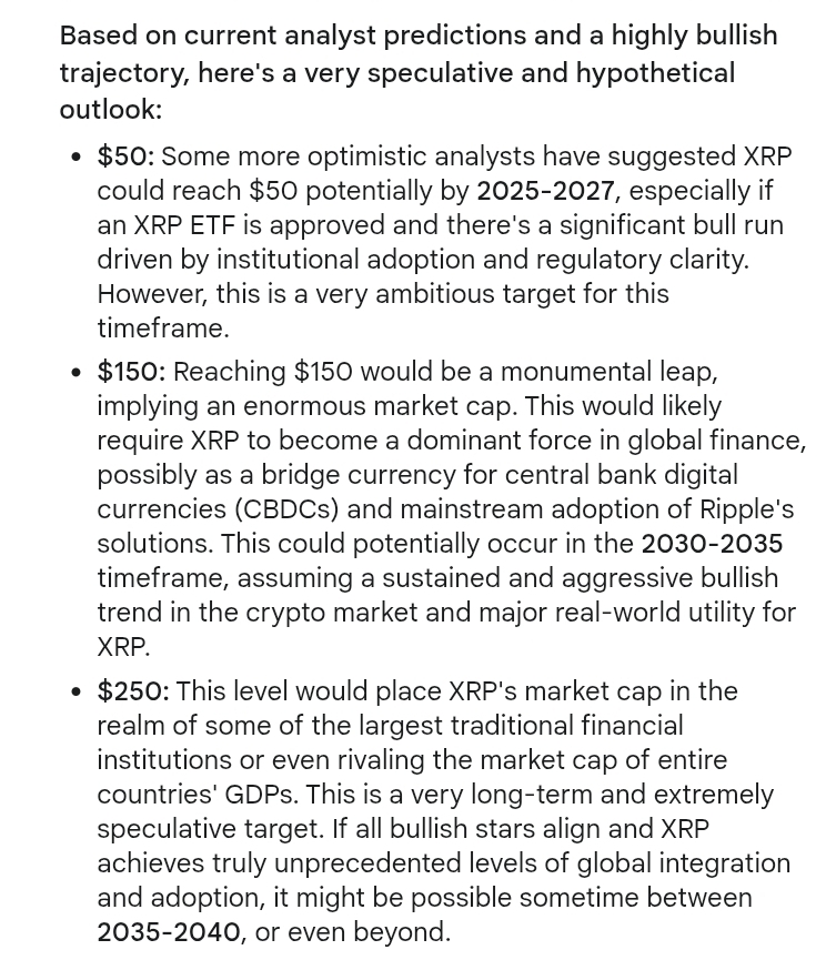 Gemini 预测,如果 XRP 成为全球金融体系中广泛使用的工具,那么 150 美元的价格目标可能在 2030 年至 2035 年间实现。而 250 美元的目标则可能要等到 2035 年至 2040 年,前提是 XRP 能够实现全球范围内的广泛应用和整合。