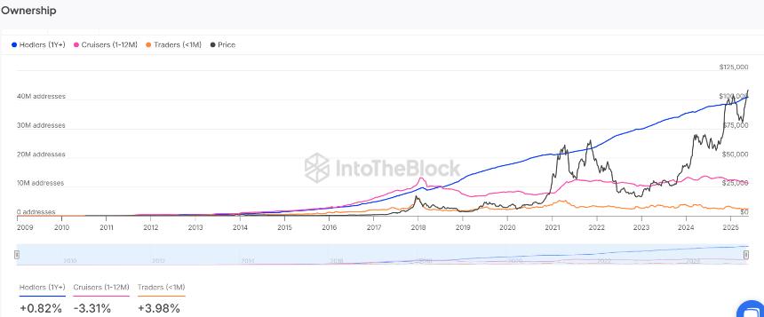 除了价格走势之外,近期比特币持有者类别的数据也为当前的市场动态提供了更多背景信息。持有比特币超过一年的地址(Hodlers)数量小幅增长了 0.82%。这表明长期持有者的数量正在增加,也体现了市场对比特币未来潜力的信心。