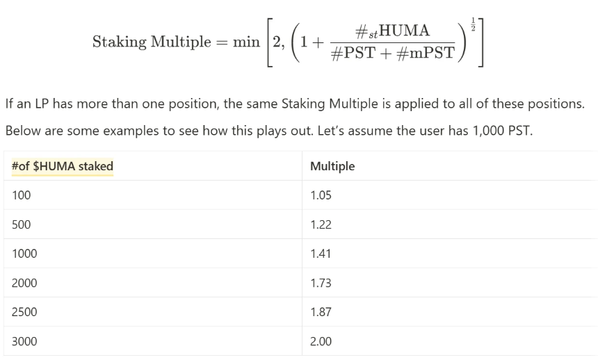 • 质押倍数:根据用户质押的HUMA代币数量与LP代币总数的比率,决定其LP奖励的额外加成。当质押的HUMA达到LP代币数量的三倍时,该倍数达到上限2。官方计算公式如下: