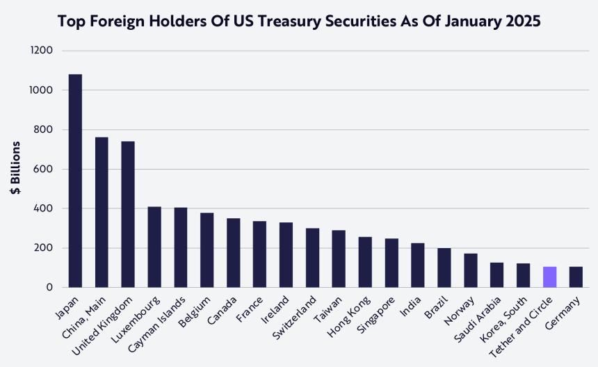 过去几年,尽管拜登政府对数字资产持负面态度,稳定币市场仍持续飙升。在加密市场剧烈波动的背景下,稳定币发行方悄然成为了全球最大的美债持有者之一,如下所示: