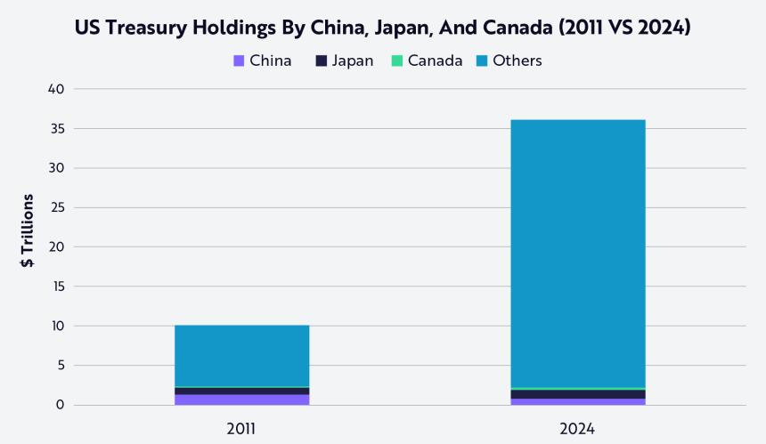 2011 年,在 10.1 万亿美元的未偿美债中,中国、日本和加拿大分别占 12.9% 、 8.7% 和 1.43% ,合计 23% 。截至 2024 年 11 月,在 36 万亿美元未偿美债中,三国持仓分别降至 2.14% 、 3.05% 和 0.95% ,合计约 6% ,如下表和图表所示: