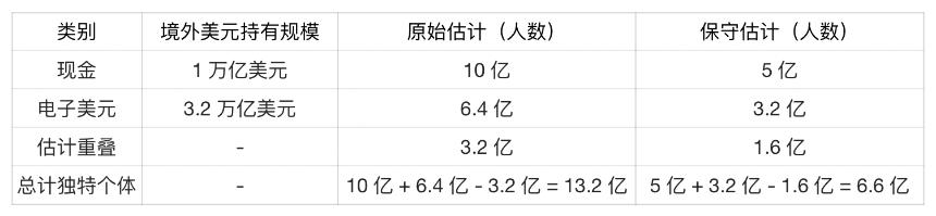 假设持有数字美元的个人中有一半也持有现金美元,重叠约 3.2 亿人。