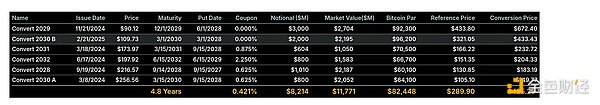 图 11:当前策略可转换债券发行情况,突出显示发行利率(票面利率)较低且到期日分布在多个比特币市场周期的可转换债券。
