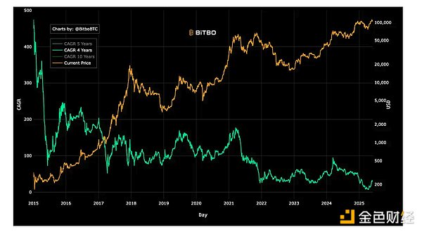 从历史上看,比特币早期的 CAGR 曾一度超过 100%。但随着其逐渐成熟,这一数字逐步下降,目前处于 40–50% 区间。预计未来十年,CAGR 将持续下滑,可能从 50% 降至 40%、再降至 30%、20%,最终趋近通胀率,与传统金融资产趋同,成为全球资产配置体系的一部分。