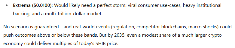 有趣的是,ChatGPT 为 Shiba Inu 设定了最雄心勃勃的 2035 年价格目标。具体来说,ChatGPT 预测,到 2035 年,SHIB 的价格可能会飙升至 0.01 美元的高位,这可能是受到强大的机构支持和数万亿美元的加密经济的推动。