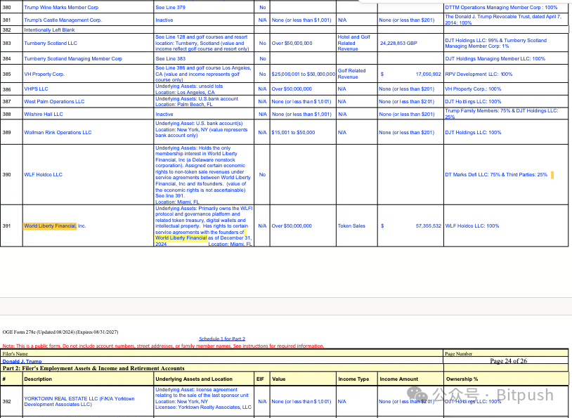 同一时间,据纽约邮报获取的美国政府道德办公室财务文件显示,特朗普个人去年从家族关联加密货币平台World Liberty Financial获得了5735万美元收入,成为其最重要的收入之一。