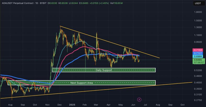 与此同时,分析师 CryptoPulse 强调,在 Cardano 的看跌趋势中,有两个支撑位值得关注。他在评论中指出,代币正呈现下降三角形趋势,需观察价格疲软是否持续存在。