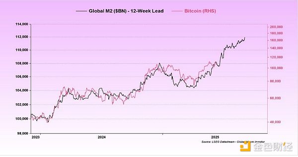 若你认为比特币本轮周期已接近顶点,请记住:比特币要追上全球M2货币供应量还有很长的路要走。Raoul Pal最近指出"比特币89%的价格走势都与全球流动性相关"。