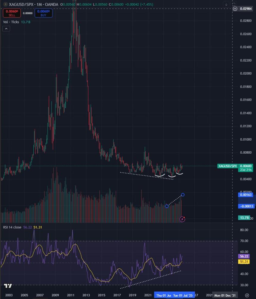 此外,Bluntz 指出,白银突破的其他迹象包括月度图表上可能出现的相对标准普尔 500 指数(XAG/SPX)的看涨倒头肩形态(IHS)。
