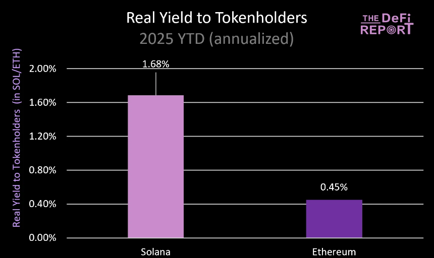 另一位研究者 @JustDeauIt 提出了“真实收益”(Real Yield)指标,这个指标指的是:来自链上用户支付的费用(包括 MEV 收入),直接分配给质押者的部分。主要回答投资者最关心的问题:我买入并质押这条链的代币,能获得多少来自真实经济活动的价值?