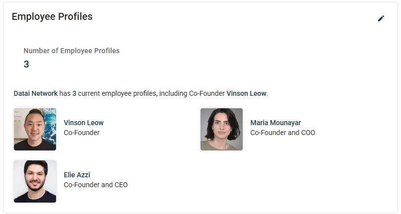Datai 由 Elie Azzi、Maria Mounayar 和 Vinson Leow 共同创立于 成立于 2020,总部位于欧洲、中东和非洲地区。Elie Azzi 曾在 R3 担任驻企企业家,并曾就读于 IMT Atlantique。Elie 还曾是 VALK 的联合创始人和 CPO/CTO。此外,Elie Azzi 曾是 Crypto MENA 的非营利组织创始人。Maria Mounayar 曾在Amazon Web Services 担任企业营销经理,并就读于贝鲁特美国大学和 ESCP 商学院。Vinson Leow 曾在 Partisia Blockchain 担任增长负责人,并就读于 UNSW。Leow 也是 Techstars 的导师和 Partisia Blockchain 的首席生态官,还曾担任 EMX 的顾问。