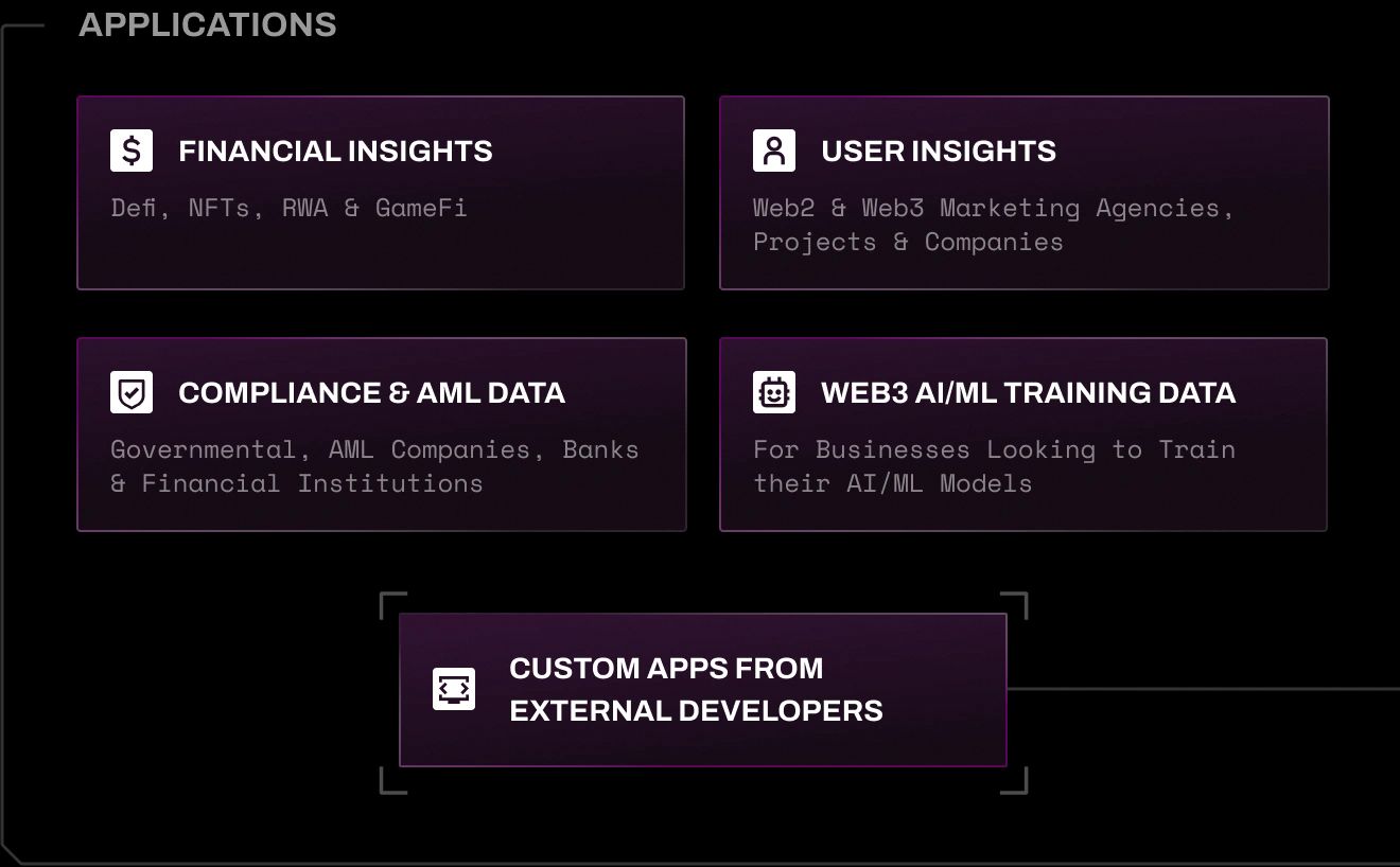 Datai Network 为政府、税 务机构、基金和加密会计提供了多种解决方案,将区块链数据转化为可操作的洞察。Datai Network 的解决方案涵盖了从追踪钱包活动到评估 DeFi 投资组合的各个方面,适用于多种商业场景,使区块链数据在现实世界中更易于获取和使用。Datai Network 非常适合处理各种 Web3 应用:
