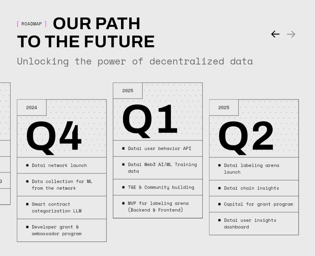 区块链有潜力改变各个行业,但为了实现这一点,数据必须是可获取、易理解和可操作的。Datai Network 计划提供一个结构化的智能层,将复杂的区块链数据转化为有意义的洞察,帮助组织和开发者充分实现 Web3 的潜力。为此,Datai 这一点对点数据智能网络已经制定了 2025 年第一季度(Q1)和第二季度(Q2)的发展路线图。第一季度的路线图包括: