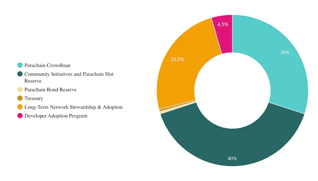 40% 用于社区计划和平行链插槽储备。30% 用于众筹平行链。24.5%用于长期网络管理和实施。4.5% 用于开发者采用计划。0.5% 归入国库。0.5%为平行链债券储备。2025年Moonriver路线图