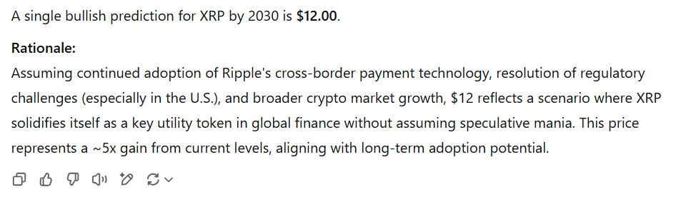 OpenAI的ChatGPT则给出稍保守的2030年12美元预测,认为该估值取决于XRP在全球金融基建中的定位,尤其是Ripple跨境技术获得机构青睐且监管障碍减少的情况下。