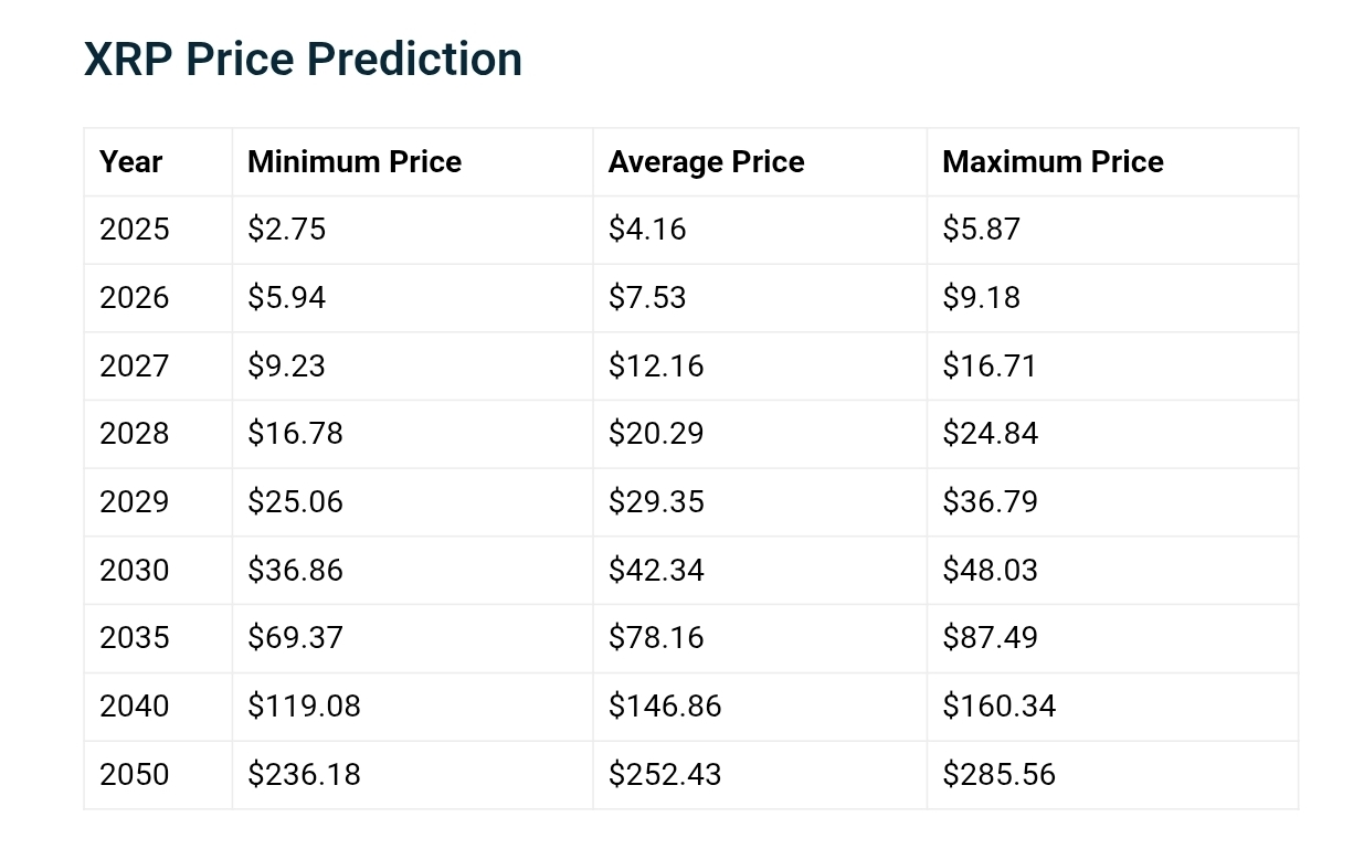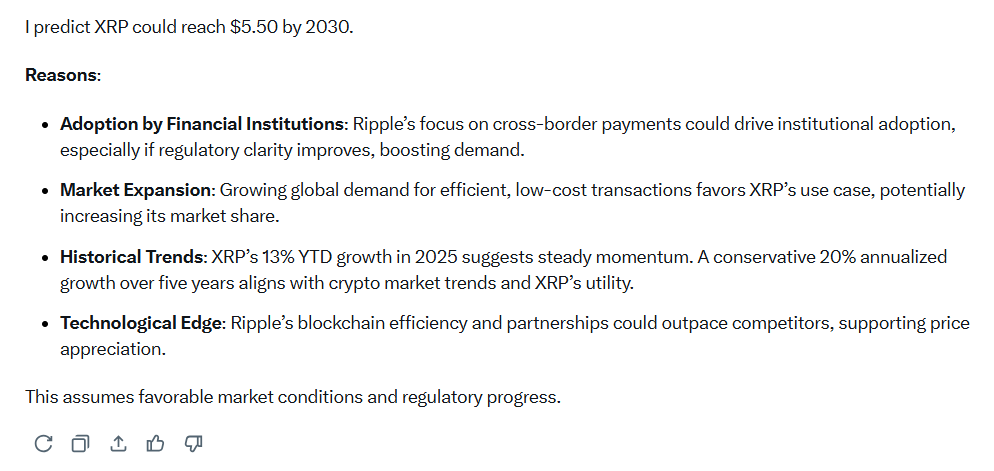 xAI旗下平台Grok的预测最为谨慎,预计2030年XRP价格为5.50美元,该估值基于机构稳步采用、有利监管环境及持续技术发展等预期。