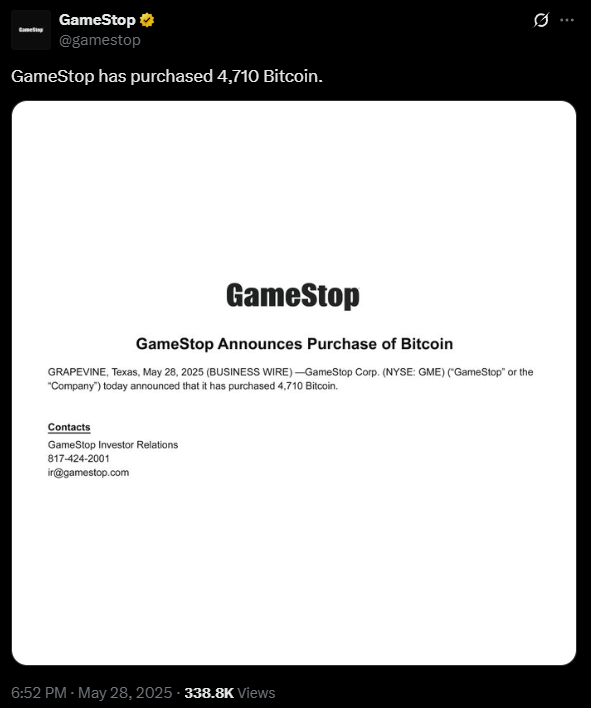 GameStop 宣布购入 4,710 枚比特币 盘前股价升近 5% 下面小编就为大家分享一篇GameStop 宣布购入 4,710 枚比特币 盘前股价升近 5%,具有很好的参考价值,希望对大家有所帮助。 * 这篇文章由人工智能(AI)根据多个资讯来源生成,功能还在测试与调整中,内容準确性和逻辑可能出现偏差,不应视为专业意见或投资建议。 美国游戏零售商 GameSto...
