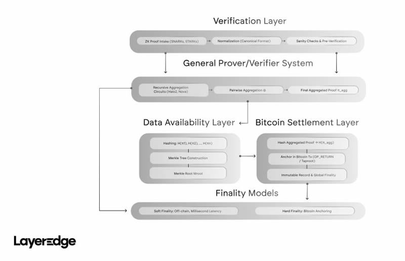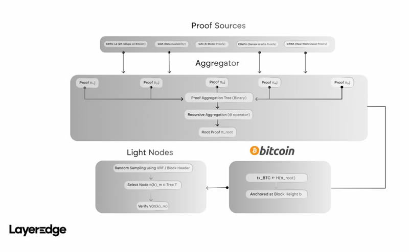 LayerEdge 将比特币从被动的价值储存转变为可验证的链下运算基础设施层。这项转变的核心是证明聚合层--这是一个模组化系统,它支持跨协定、应用程序和资料管道进行递归零知识证明(ZK)验证,其最终性植根于比特币的工作量证明(PoW)。
