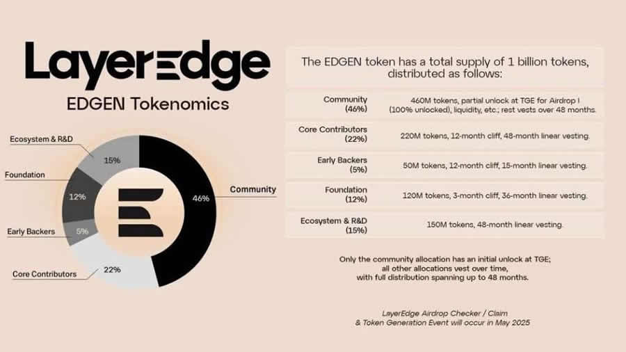 LayerEdge(EDGEN)币将于2025 年5 月举行代币生成事件(TGE),将与空投同时发生。