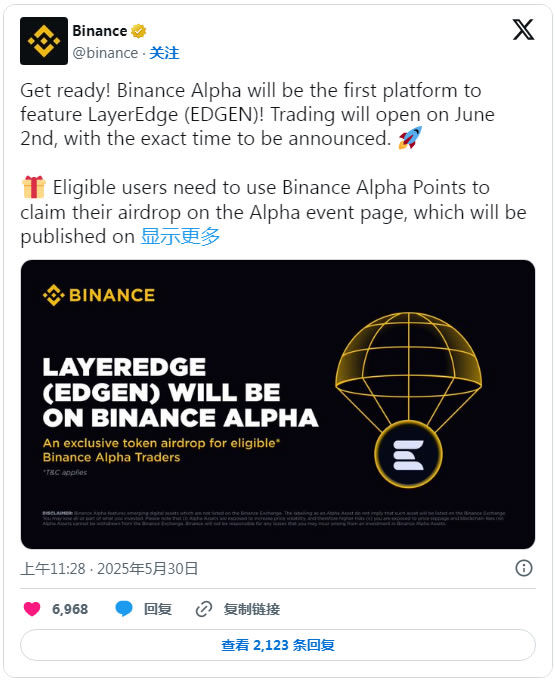 另外,币安Alpha 将上线EDGEN 币。 EDGEN 交易开放日期为6 月2 日,符合资格的用户需要在Alpha 活动页面使用币安Alpha 积分领取空投,活动页面和细则将在6 月2 日上线。