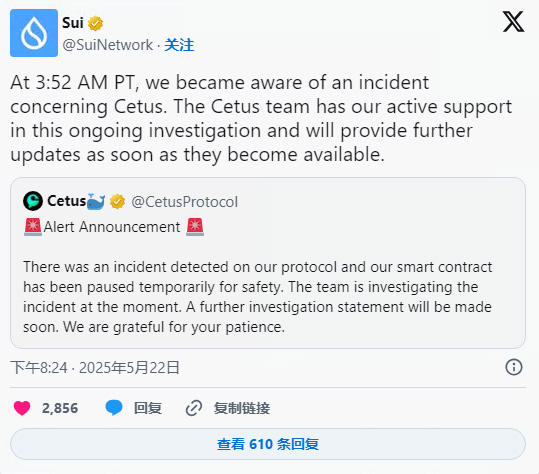 2025 年1 月29 日,Phantom 钱包正式宣布支援SUI 主网,Sui 成为继Solana 与Ethereum 之后,第三个被完全整合的Layer 1 公链,也是唯一支援的Move-based 区块链。Phantom 拥有超过1,500 万活跃用户,此次整合意味着用户能透过Phantom 钱包管理SUI、交易代币、浏览DApp(如Suilend、Bluefin、Aftermath 等),也能更容易地跨链探索Sui 生态。? 此举不仅强化了Sui 的跨链能见度,也显示其在使用者体验、资产安全与生态完整性上的全面升级,标志着Sui 正式迈入多链互通与主流用户扩张的全新阶段。2025 年5 月:Cetus 协议遭骇逾2 亿美元,SUI 价格与去中心化备受考验