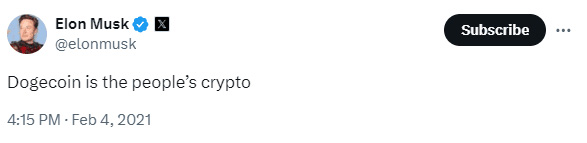 此外,马斯克也经常利用X 平台发布对于狗狗币的消息,对于币价的抬升有显著的效益,例如他曾在X平台的受访中提到: