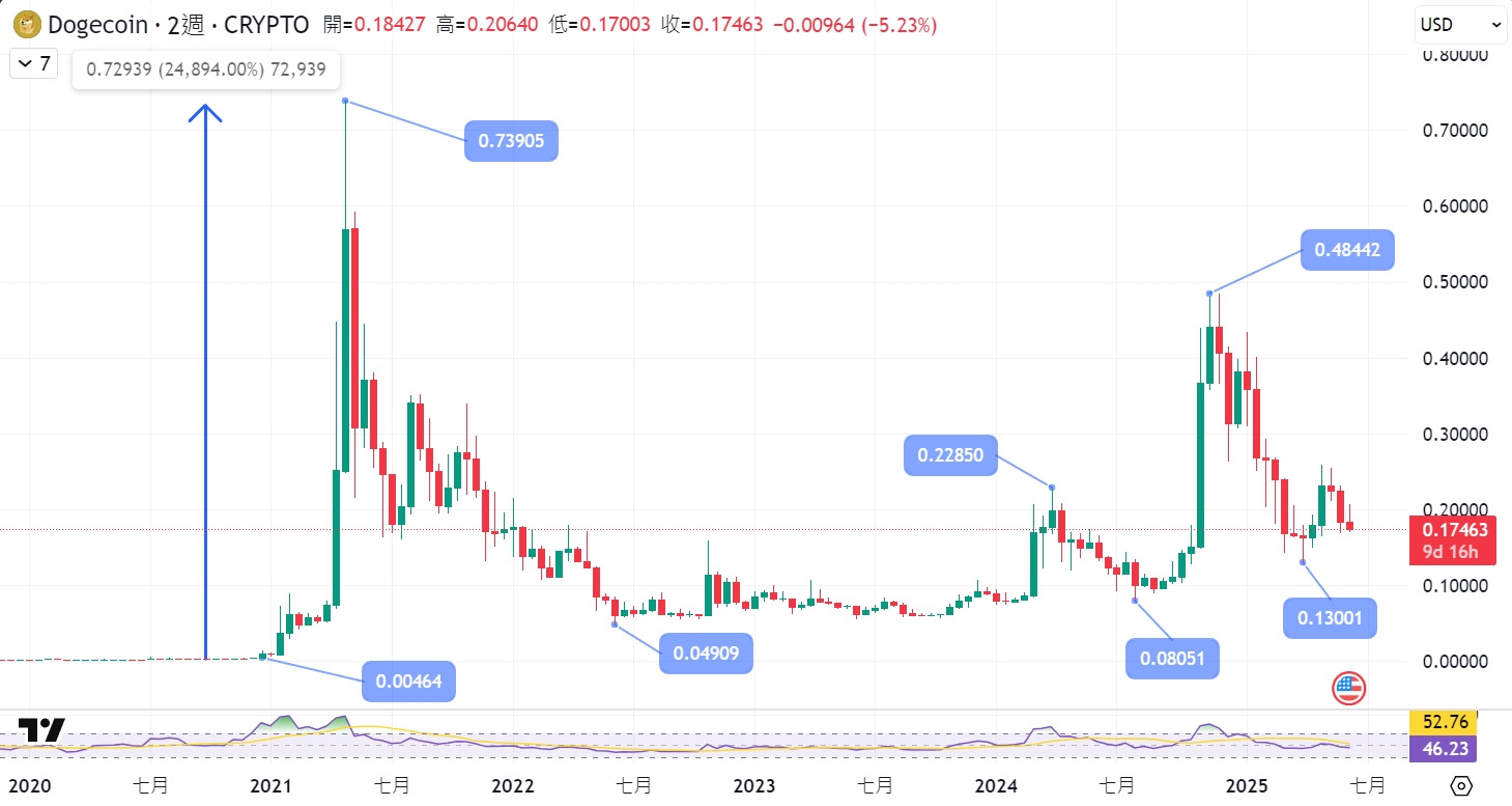 高点过后DOGE 出现获利回吐,2025 年初一度回落至0.13001 美元,但随即反弹,目前价格约落在0.17463 美元,处于中期整理阶段。