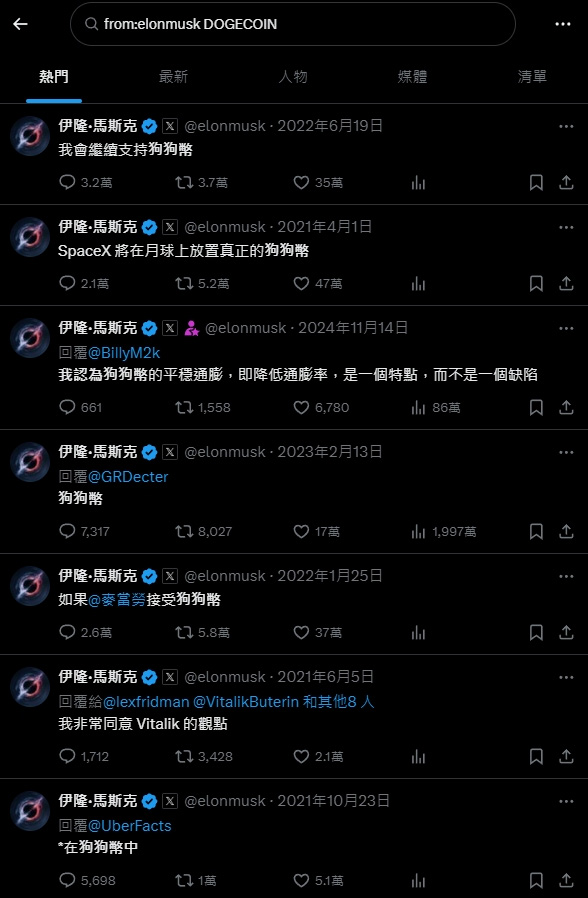 ?补充资料:马斯克对狗狗币的支持并非三言两语,而是长期、大量、频繁地发声。下图为他在X 平台上多次发表关于狗狗币的贴文截图,可见他对DOGE 的关注程度,在币圈与社群中持续发挥影响力: