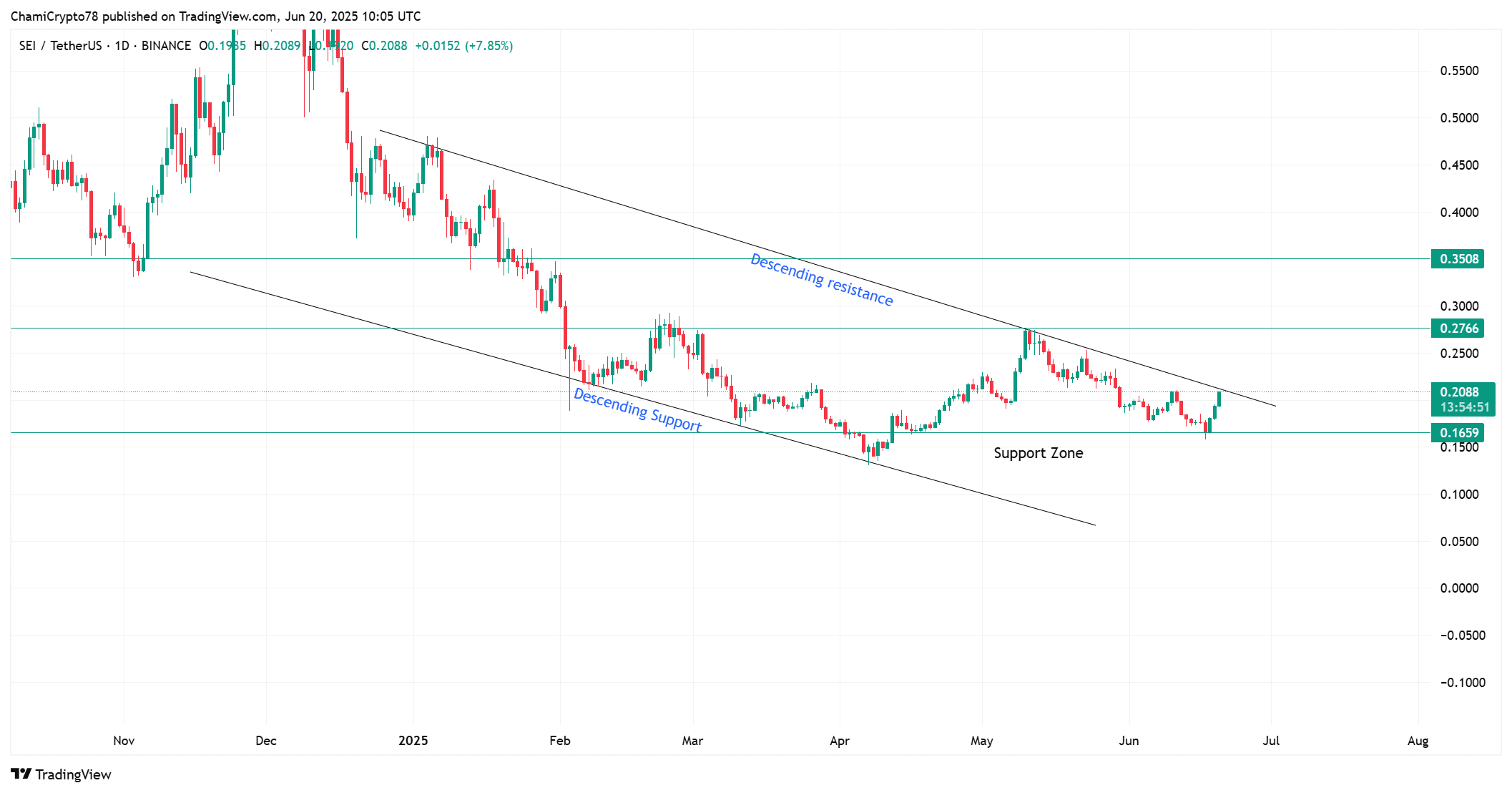 从0.1659美元支撑位反弹后,SEI正测试0.2135美元附近阻力位。若突破0.2766美元将扭转整体下跌趋势,并为冲击0.35美元打开空间
