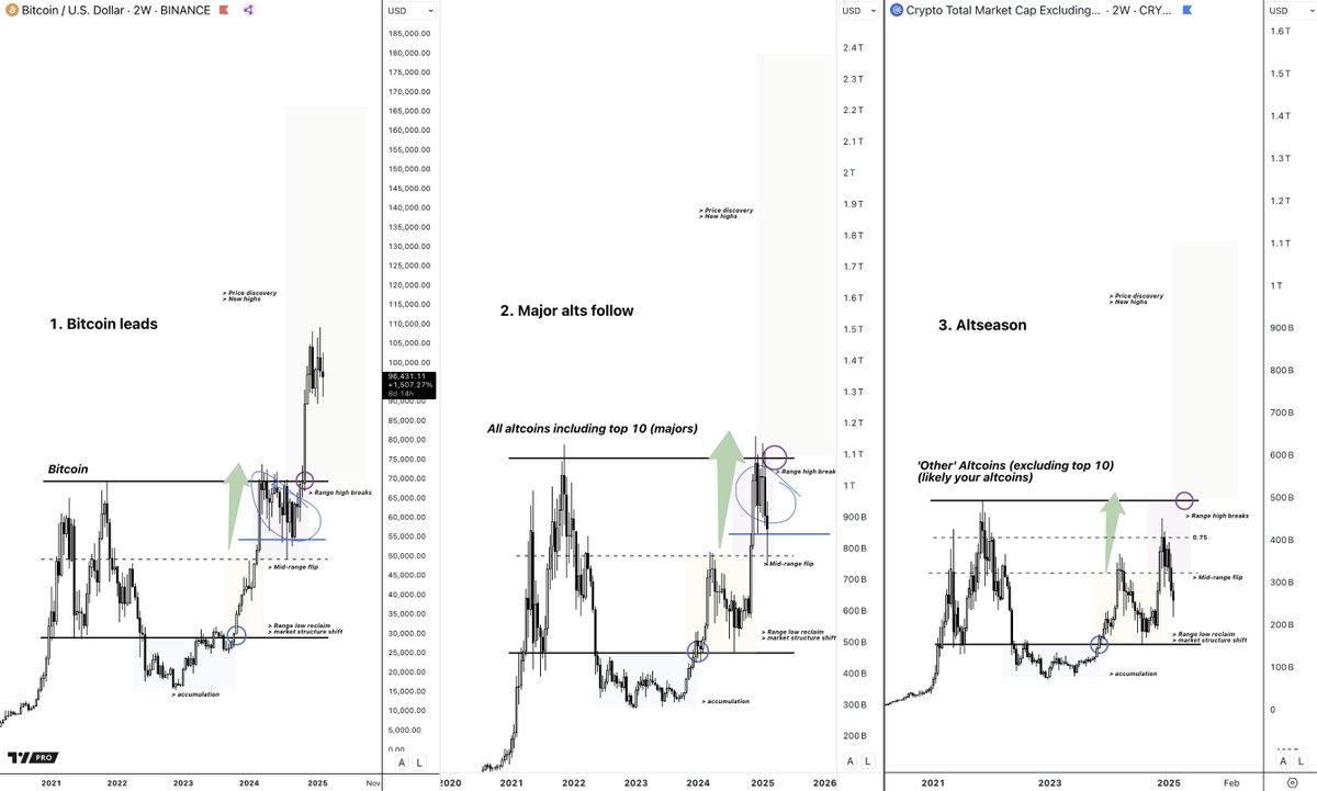 山寨季的启动通常由比特币牛市引发,但这并非依赖于QE。 资金流动路径清晰:比特币→主要山寨币→高市值代币→中市值代币→低市值代币。 媒体炒作和投资者追求更高收益,进一步推动资金流入山寨币市场。 这一现象通常发生在比特币第二次突破新高阶段。