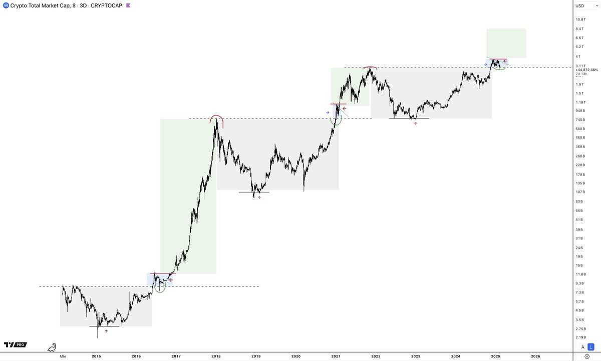 QE虽然能促进市场增长,但并非山寨季的决定性因素。 山寨季的到来更多取决于比特币的周期性上涨、市场情绪以及资金的逐步流入。 目前市场已从7000亿美元增长至接近4万亿美元,这表明我们正朝着山寨季的方向发展,而这与QE/QT政策无关。
