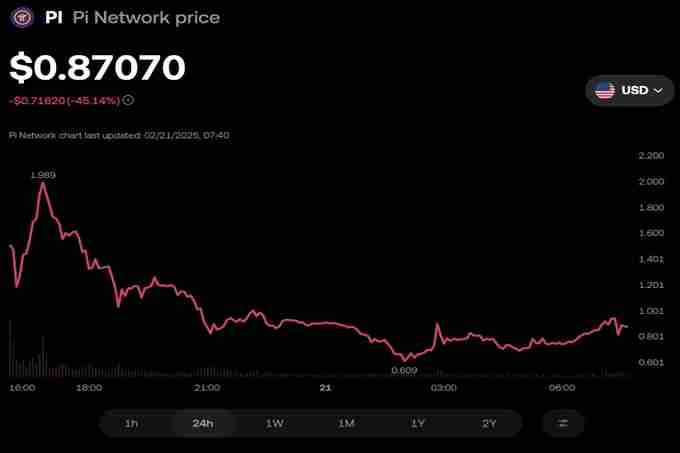 上市后,PI币一度飙升45%,达到2.10美元,交易量暴增超过1700%。然而,这波上涨昙花一现,数小时内PI币暴跌逾52%,跌至1.01美元,市值跌至70.2亿美元,引发市场对长期价格稳定性的担忧。