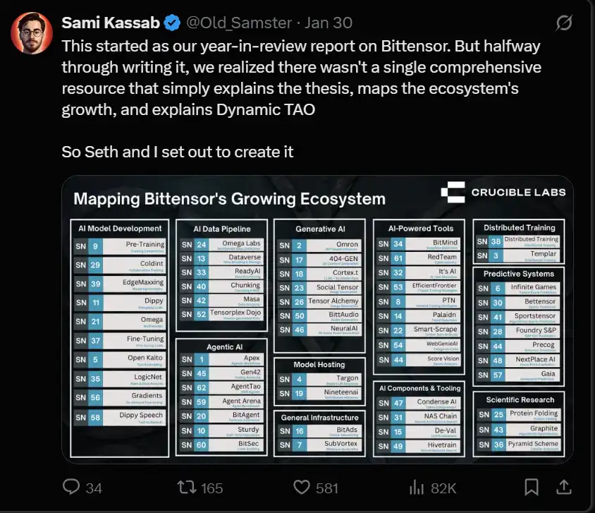 子网 1(根子网)专门用于文本提示,由 opentensor 基金会拥有;目前它持有大部分质押的 TAO,总市值为 20.9 亿美元。2023 年 10 月,网络扩展了更多子网,现在共有 69 个子网,这些子网由基金会之外的第三方拥有。这是 old samster 在 Crucible Labs 对这些子网的一个精彩划分: