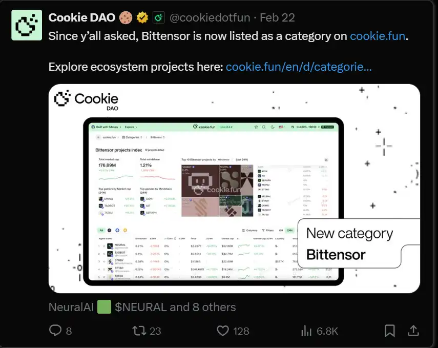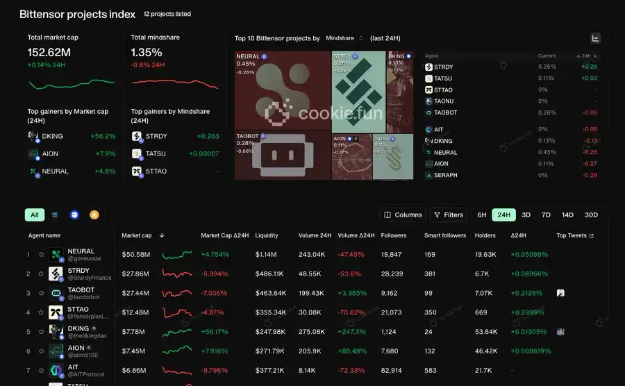 最终,价值的积累来自于应用开发者和最终用户,他们创建利用 Bittensor 子网 AI 模型的产品。Cookiedotfun 最近推出了一个仪表板,突出了部分利用 Bittensor 的代理: