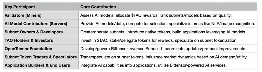 与传统的中心化 AI 系统(如 OpenAI)不同,Bittensor 创建了一个开放的点对点生态系统。参与者会因其贡献(如计算资源、数据或 AI 模型)而获得奖励。