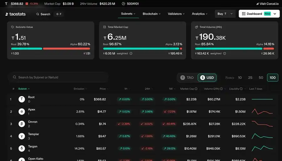 但在你全力出击购买子网代币之前,确保你了解每个子网的排放机制以及核心价值主张。目前,所有 70 个子网的总市值为 7250 万美元,注册一个子网目前需要 408 个 TAO(约 15.1 万美元),且现在是不可退款的: