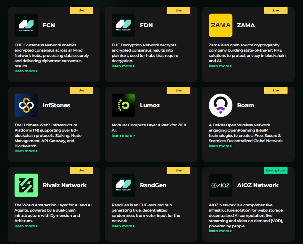 现已有多个协议与Mind Network建立合作。除了FCN、FDN等项目衍生协议外,现已上线的外部协议包括ZAMA、InfStones、Lumoz、Roam、Rivalz Network、CARV、Chainlink等知名协议。尚未上线的有Pendle、Manta Network、Solv Protocol、StakeStone等协议。