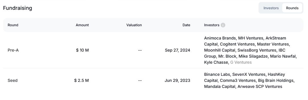 Mind Network一共进行两轮融资。种子轮融资于2023年6月29日进行,由Binance Labs、SevenX Ventures、HashKey Capital等参投,融资金额为$2.5M。Pre-A融资于2024年9月27日进行,Animoca Brands、MH Ventures、ArkStream Capital、Cogitent Ventures等参投,金额为$10M。