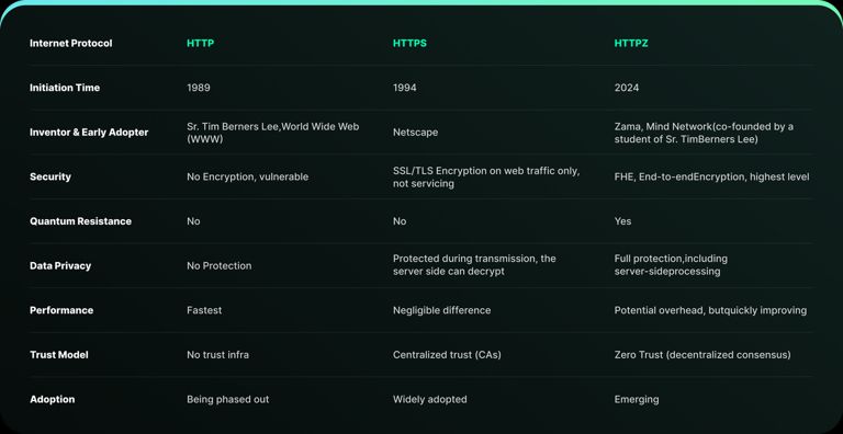 Mind Network 的 HTTPZ(零信任互联网传输协议)通过集成 FHE 扩展了 HTTPS,实现数据传输、存储和计算的端到端加密。这创建了一个在整个生命周期中数据始终保持加密的零信任数字生态系统。