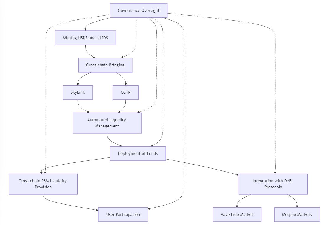 2024 年:通过 zk-Rollup 构建专属流动性层,计划将 Gas 成本压缩至 Uniswap V4 的三分之一;最终形成覆盖借贷、衍生品与支付的全场景 USDS 经济闭环。