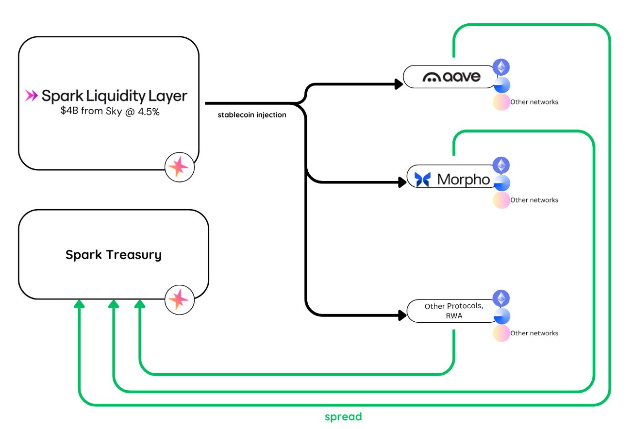 Spark 流动性层 (SLL) 可自动从 Sky 向各种区块链网络和 DeFi 协议直接提供 USDS、sUSDS 和 USDC 的流动性。这使用户能够使用 sUSDS 在其首选网络上轻松赚取 Sky 储蓄利率。此外,它还允许 Spark 自动向 DeFi 市场提供流动性以优化收益。Spark 流动性层是多链和跨协议的。这允许将 Spark 引导的流动性注入分配到所有主要借贷市场。