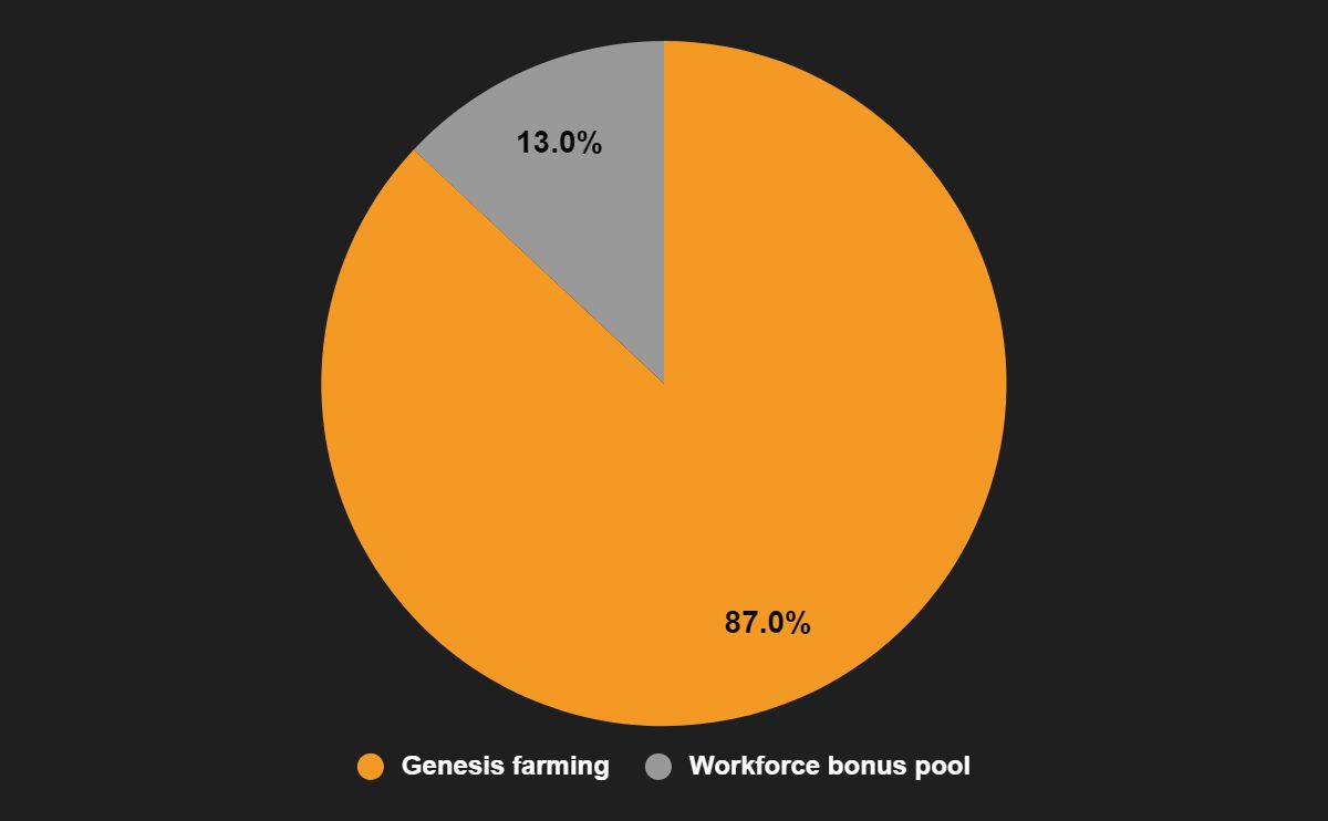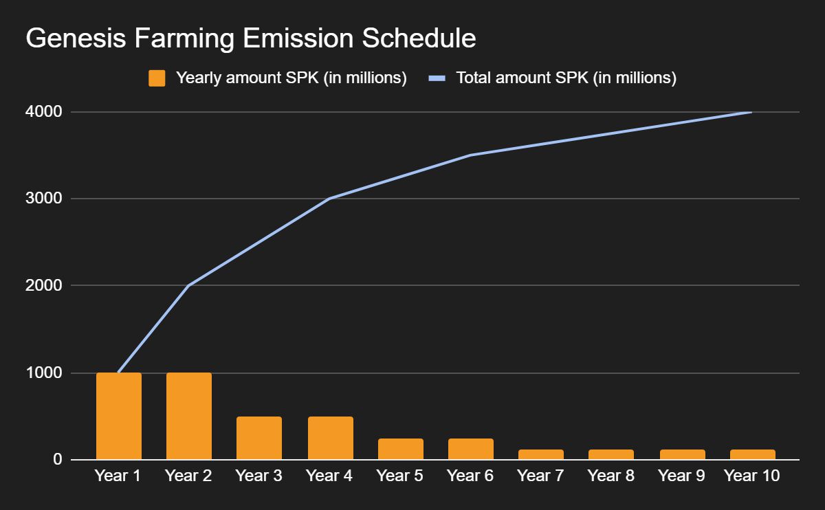 SPK 的发行遵循 Sky Endgame 中 MIP101: Sky Atlas Immutable Alignment Artifact 中的规则,其中规定前 10 年将发行 46 亿个 SPK 代币。其中 40 亿个代币通过创世挖矿发行,随着时间的推移逐渐减少,6 亿个代币分配给劳动力奖金池。请参阅下面的分配图: