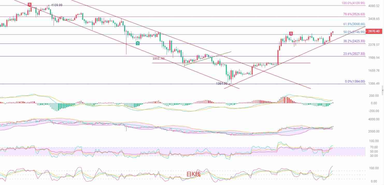 以太坊逼近关键阻力,多空博弈或将加剧 以太坊(ETH)现价2870美元,正处于一个关键的十字路口。从盘面来看,向上突破可能打开新的上涨空间,但同时也面临着技术指标超买和顶部背离的风险。日线图分析 日K线显示,以太坊在回踩黄金分割线0.5(具体数值未给出,但可推断在2753附近)后反弹向上。EMA趋势指标呈扩散态势,表明短期均线系统呈现多...