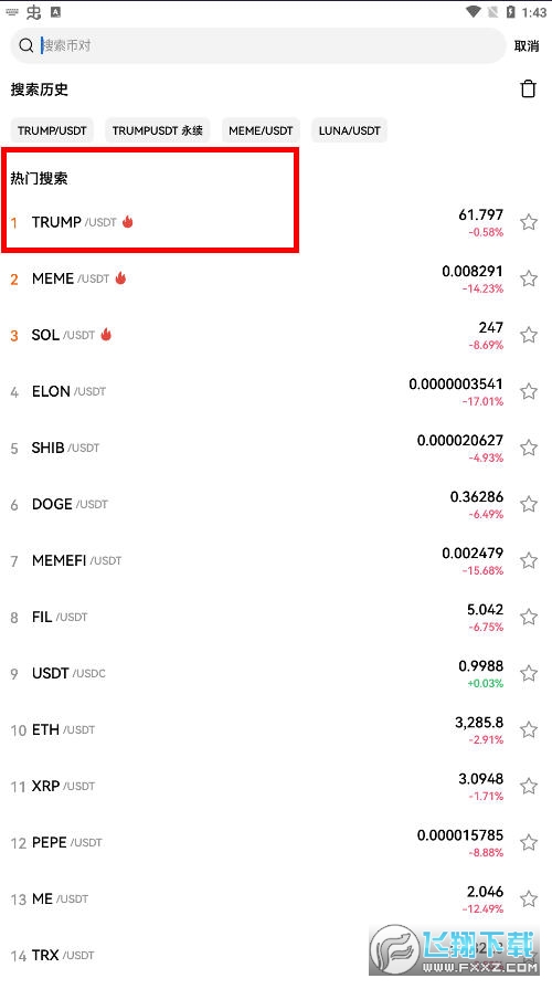 3、点击搜索框,下方自动推荐热门币种,选择trump币;
