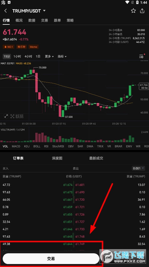 4、在trump币实时价格的详情页,点击左下方的“交易”;